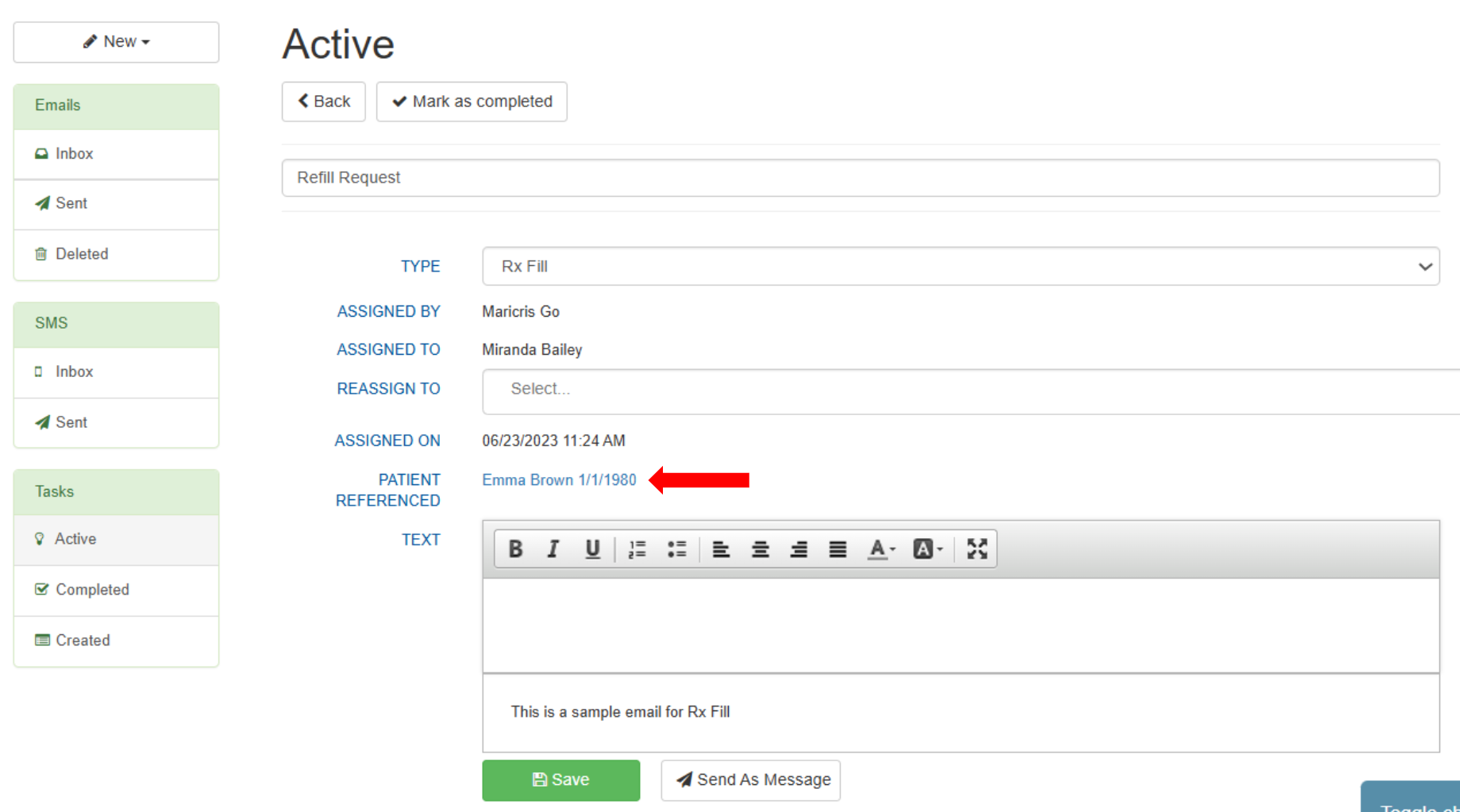 - Within the Messaging → Emails section, any message linked to a patient will now display the patient’s name as a hyperlink.