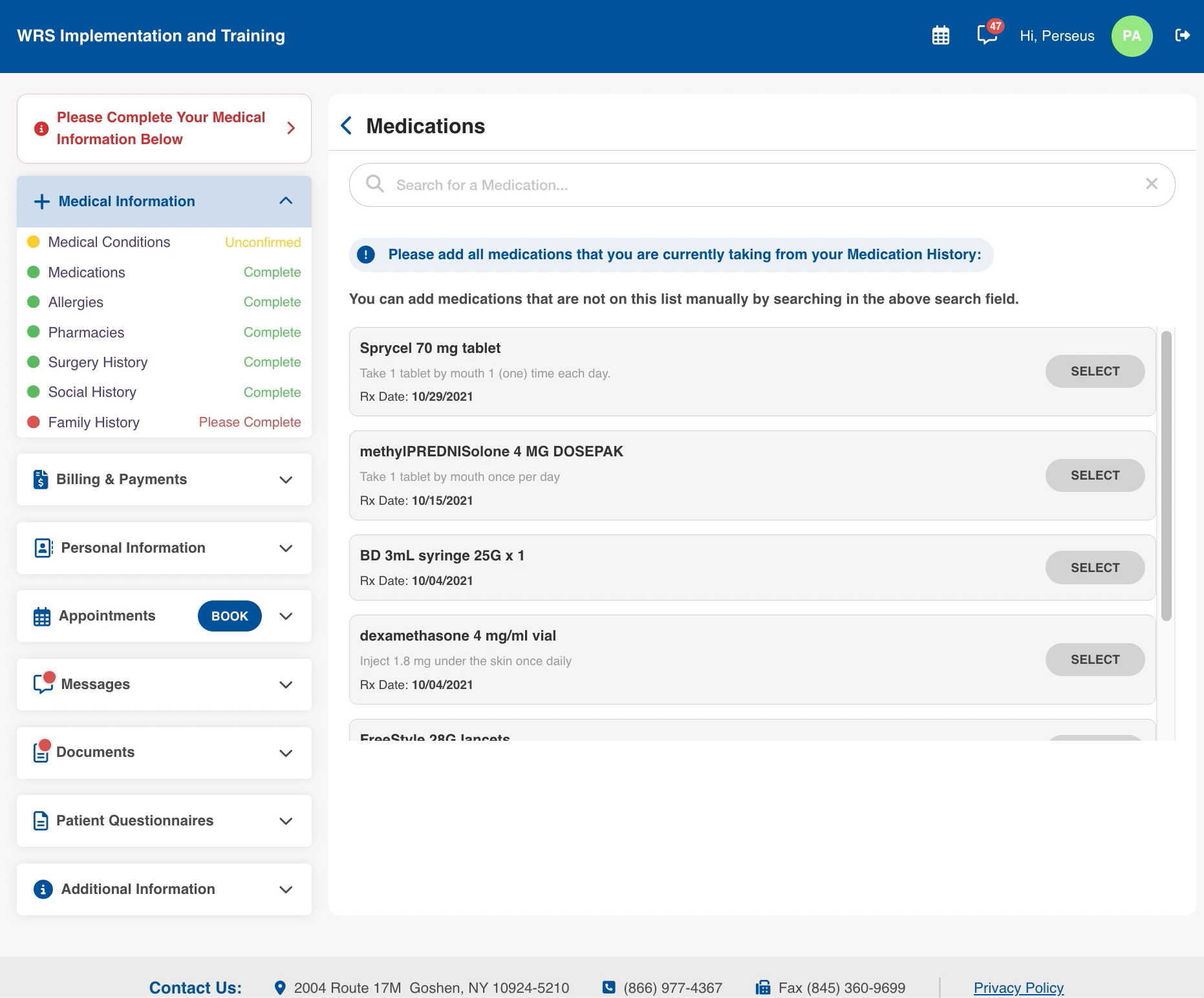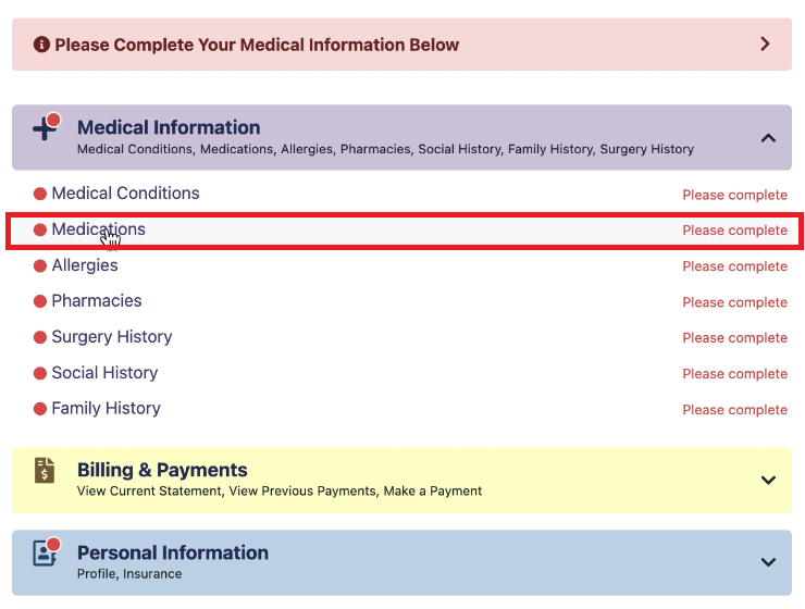 When a new patient logs in to the Patient Portal and navigates to: Medical Information → Medications
