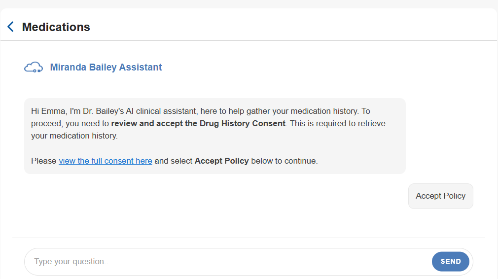 Previously, medication history requests could not be processed if required demographic data or consent are missing from the patient’s record. With this enhancement, the agent automatically checks whether the necessary information is available and prompts the patient to provide any missing data during the Medication Reconciliation process.