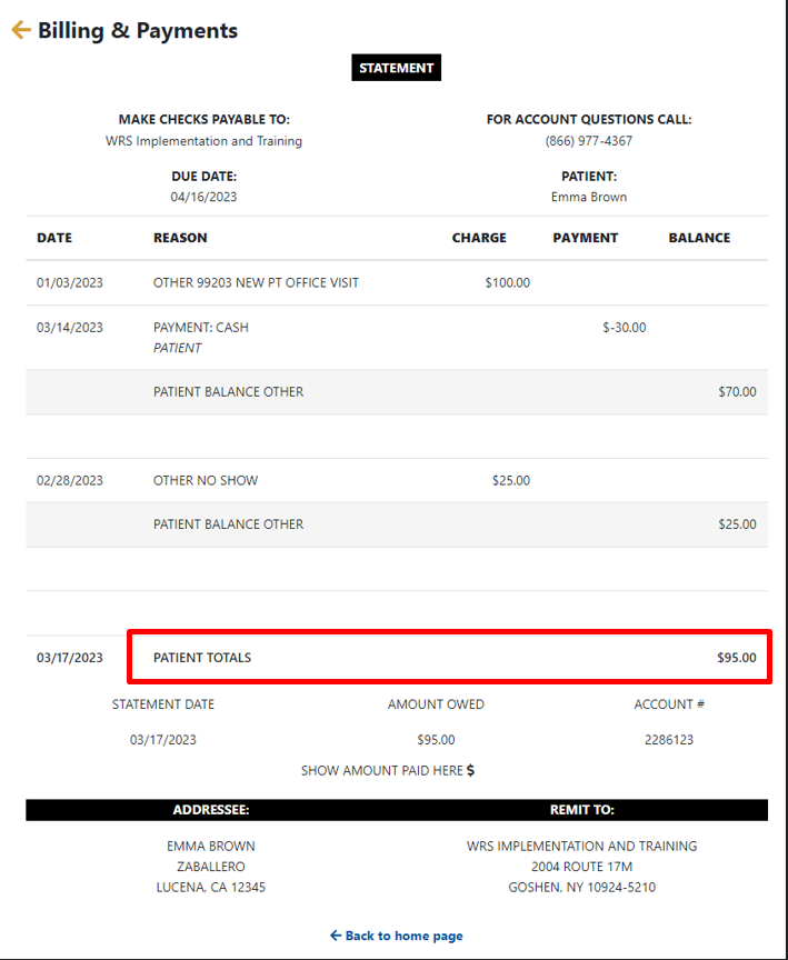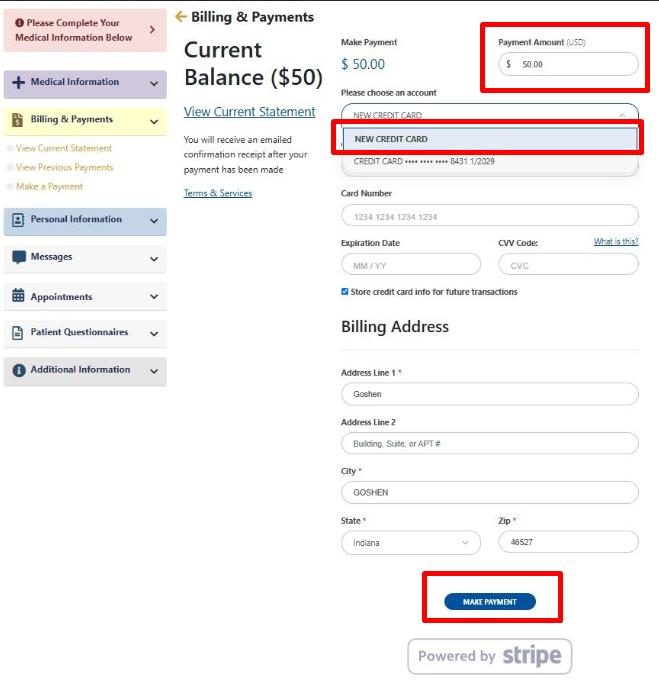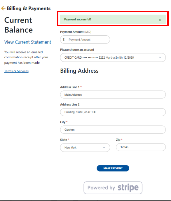 When available, patients can easily pay their medical bills online. In the Billing and Payments section, they can view their current statements and make secure payments using a credit card.