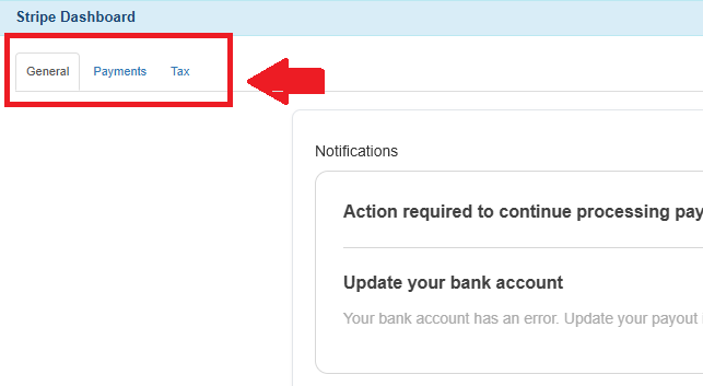 The Stripe Dashboard within EHR lets you view and manage key Stripe account details—such as notifications, account settings, payments, payouts, disputes, and tax settings—without leaving the system.