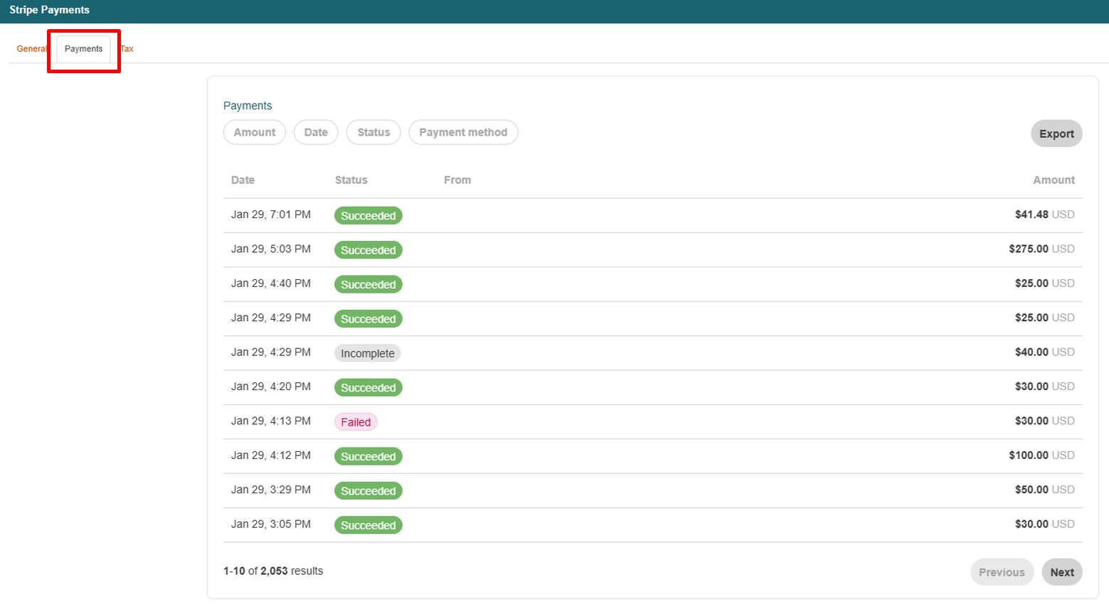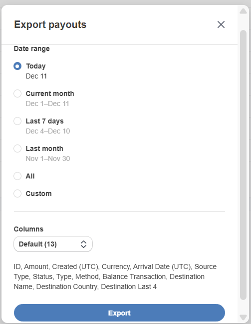 If you need to analyze your data outside the Stripe Dashboard, you can export your Payments, Payouts, or other reports to a CSV file.To export:- Go to the section you want to download (e.g., Payments or Payouts).