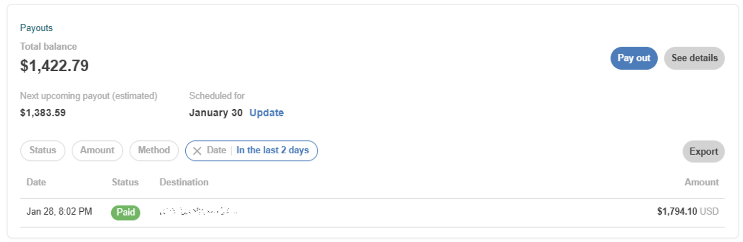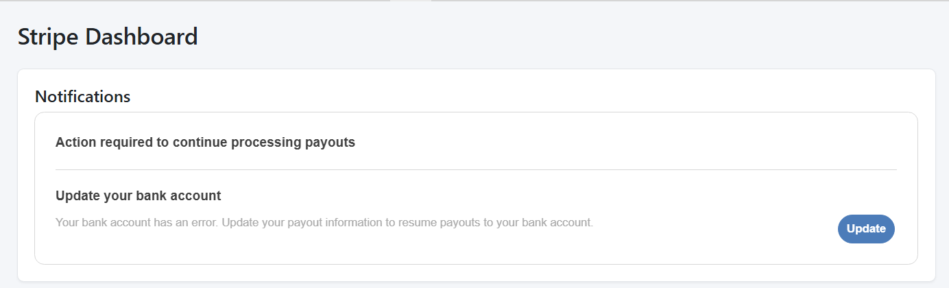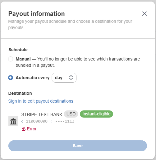 → Use the available update options to adjust payout-related settings—such as payout schedule/timing or bank account details.