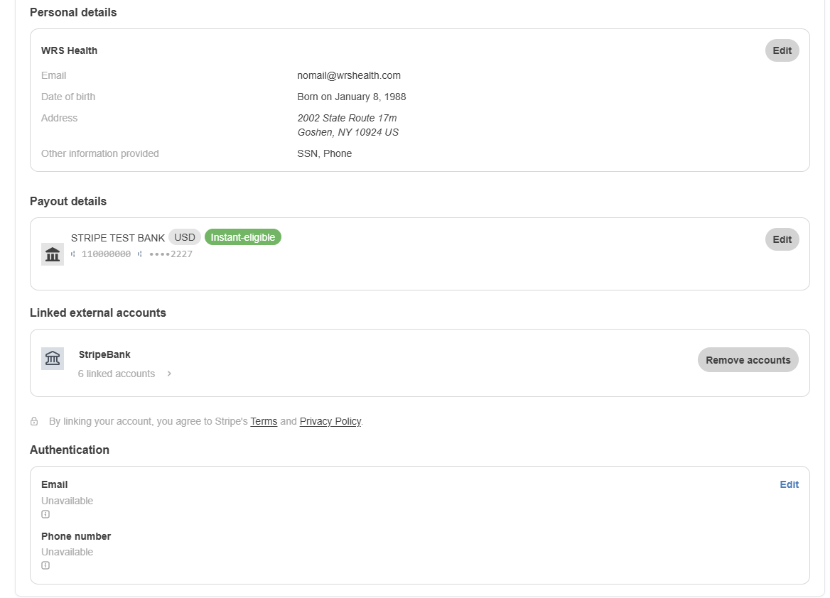 Note: Management access is subject to your user role, permission level, and Stripe’s compliance and verification requirements. Some fields may be read-only.