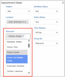 4. In the filter panel, select one or more providers/resources from the Resource dropdown. This works the same way as selecting multiple practice locations.